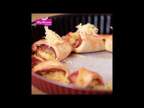 أضيفي لكل مثلث عناصر الحشوة ( الڭرعة، الجبن ، الفلفل ، اللحم المدخن)